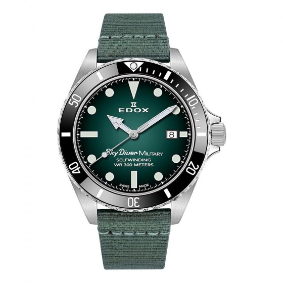 SkyDiver 300米防水,採用自動三針瑞士機芯,搭配潛水錶陶瓷圈和錶底蓋降落傘圖案 灰色軍用尼龍錶帶配搭完美的漸層綠錶盤,特殊的皮革袋中配有一條白鋼鍊帶 藍寶石水晶錶鏡 和Superluminova X1夜光指針和刻度將確保在極端條件下的耐刮和可讀性。