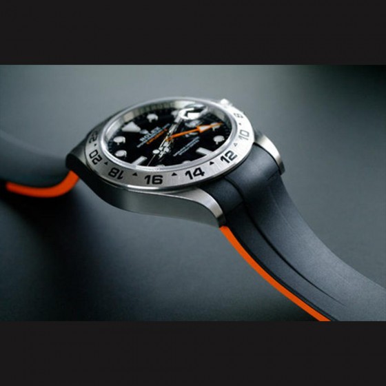 硫化雙色橡膠錶帶設計適合 Rolex Explorer II 42mm 226570 錶殼和 Oyster Deployant 表扣。這款錶帶採用“ Blocked Integration ”工程,結合實心嵌件,可完美、固定地嵌入安裝到 226570 Explorer II 42 毫米錶殼上。
