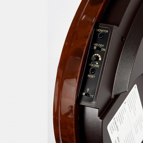 - 除了底部和麵後不斷擺動的鐘擺外,這款時鐘還與它的機芯配合選擇了 30 首旋律中的一種,包括 12 首流行旋律、12 首經典旋律和 6 首聖誕歌曲