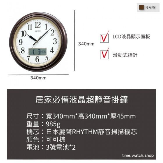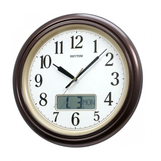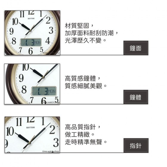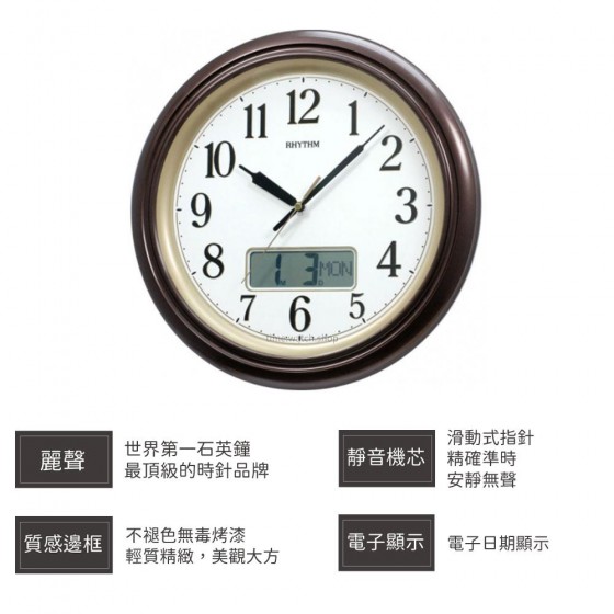 RHYTHM 日本 麗聲 CFG714-NR-06 輕生活居家公司適用日期液晶顯示超靜音掛鐘/34cm