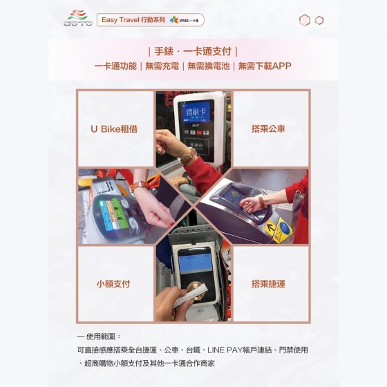 特點一:無需開卡或是下載APP,行動手錶相當於一張一卡通之普通卡,手錶錶面即為感應面,消費者購買後直接儲值金額,即可直接使用。