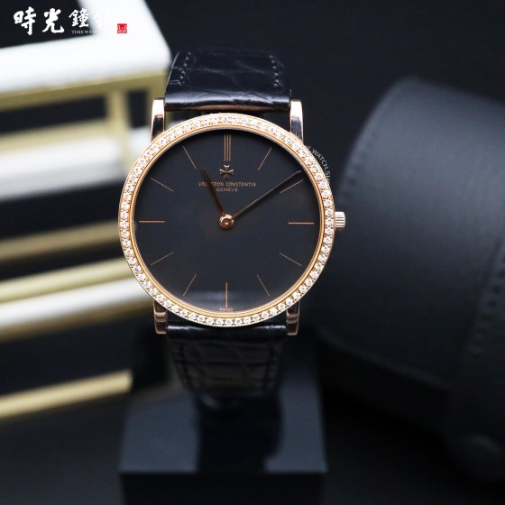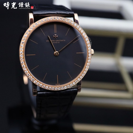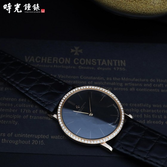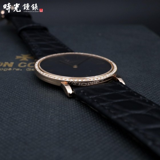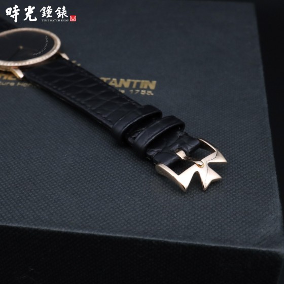 【材質】:玫瑰金材質錶殼及馬爾他十字穿帶錶扣 / 原裝鑽圈 / 立體鑲嵌時標 / 黑色面盤 / 黑色鱷魚皮錶帶 / 藍寶石水晶玻璃鏡面 / 表殼厚度僅6.79mm
