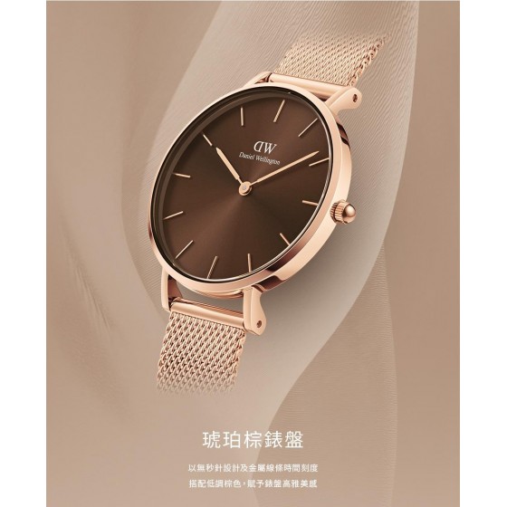Petite Amber 具有閃耀獨特的琥珀棕光澤錶盤, 完美詮釋溫暖活力和大膽前衛的時尚風格. 錶身由拋光不鏽鋼精鋼(316L)材質製成, 搭配優雅的玫瑰金色塗層, 宛如一抹陽光, 讓妳輕鬆創造質感系氛圍