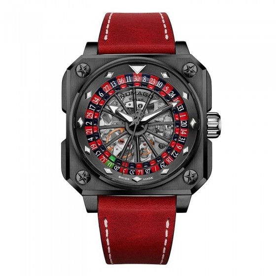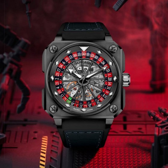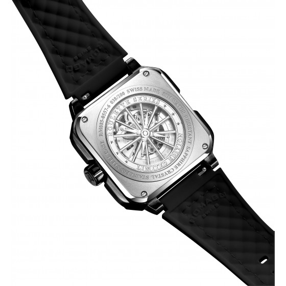 盛載於 46.5 毫米錶徑的精鋼鍍黑方形錶殼內,賦予錶款閱讀時間以外的可玩性。設計團隊巧妙