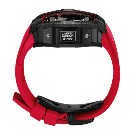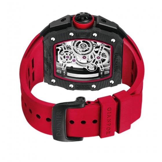 機芯資料及功能:高擺動頻率陀飛輪鏤空設計手動上發條機械機芯,陀飛輪透視劍形橋拱及六角型蜂巢式設計機芯支架,並獲得外觀設計專利
