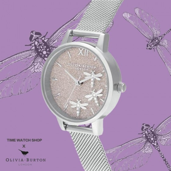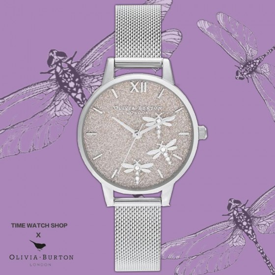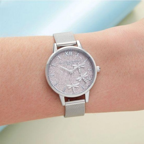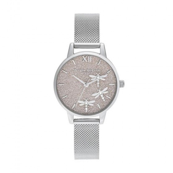 Olivia Burton OB16GB02 銀殼蜻蜓碎鑽面銀色米蘭編織腕錶