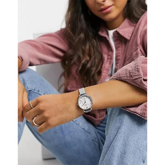 該設計是Olivia Burton的閃閃發光錶盤系列,具有醒目的閃閃發光設計。这款手表展示了带有灰色閃光錶盤的銀色配色方案。錶殼由不鏽鋼制成,表殼寬度為30mm。表帶由不鏽鋼制成,並配有折叠式表扣。該型號在表盤的12點和6點位置帶有羅馬數字,以達到經典效果。