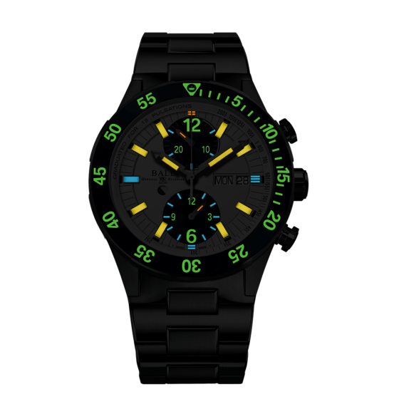 以鈦金屬及不銹鋼打造的41 毫米錶殼,以輕巧材質確保佩戴的舒適性,即使在極端溫度下也依然擁有高度耐撞擊及值得信賴的耐用性,錶殼厚度僅有14.8 毫米,配襯不同服飾均合適,計時碼錶功能採用專利按鈕鎖定設計,與脈動計配合使用,可以測量心跳頻率,而兩個備氣燈點亮的小錶盤則可累計時間,豪邁的鈦金屬錶殼上是不銹鋼製的錶圈,裡面鑲嵌了高度抗磨損的陶瓷字圈,並帶有60 分鐘刻度,在三角形標記的中心,嵌入了一支微型氣燈,確保了在黑暗中綻放明亮的光芒,使單向轉動錶圈可在任何場合使用倒數計時。機械機芯採用了特製的機芯油,讓腕錶可於攝氏零下45 度至80 度 (即華氏零下49 度至176 度) 的溫度範圍,確保運作時的精準度。