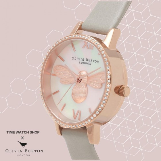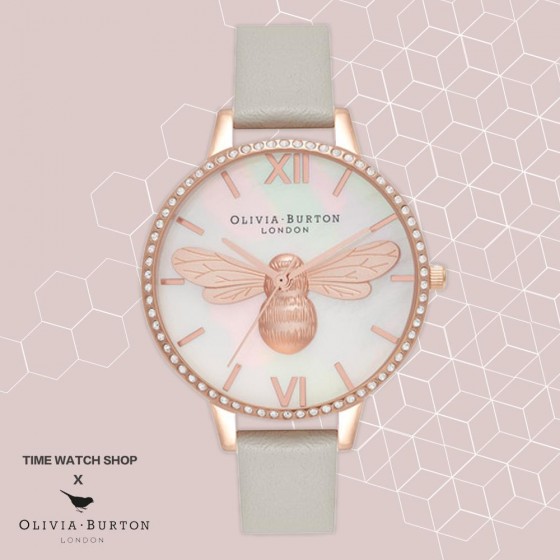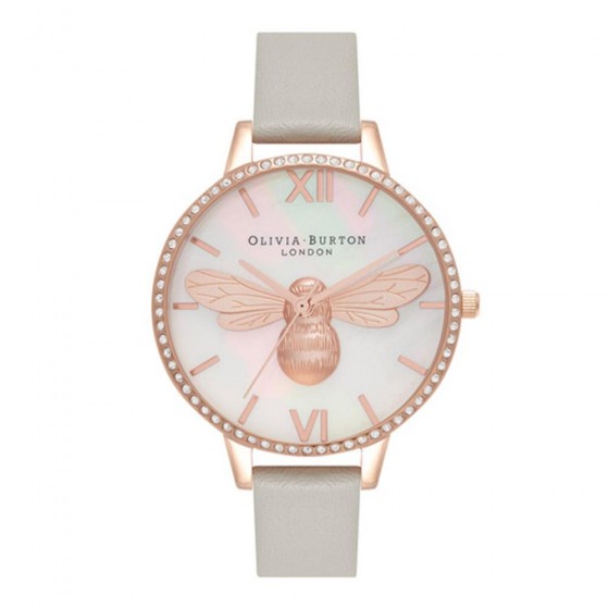 Olivia Burton OB16BB17 玫瑰金鑽殼母貝面3D蜜蜂淺灰皮帶腕錶