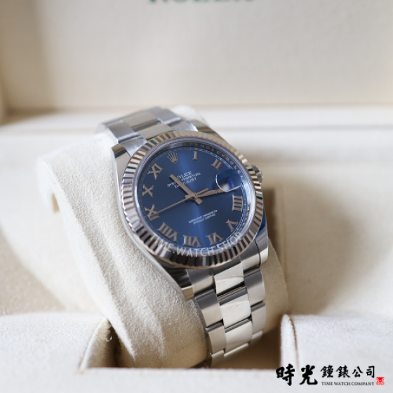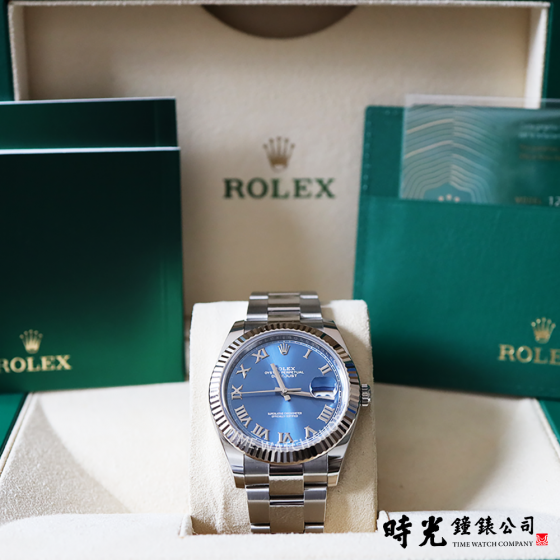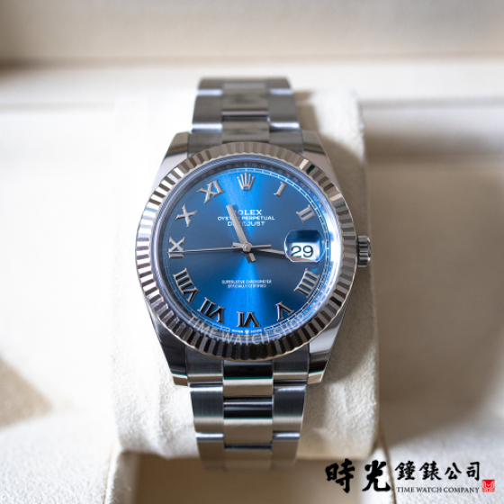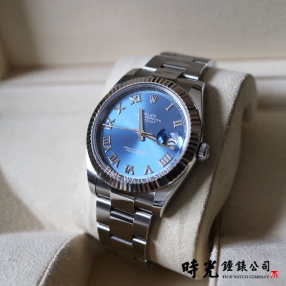 Oyster Perpetual Datejust 41腕錶白色黃金及蠔式鋼款,搭配亮藍色錶面及蠔式(Oyster)錶帶。