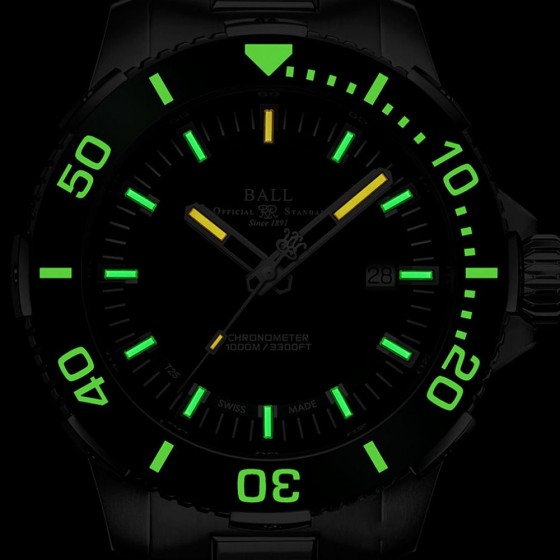 錶盤上鑲嵌了自體發光微型氣燈,克服於昏 暗環境不能清晰讀取時間的問題。以微型氣燈 組成的阿拉伯數字及刻度,除了在黑暗環境綻 放懾人光茫外,日光之下觀賞依然是十分搶 眼。三支指針上都同樣配有微型氣燈,再加上 單向轉動錶圈上的帶有「Super LumiNova」超級 夜光塗層的刻度,就算在昏暗的水底下,依然可使用錶圈輕鬆計算已下潛時間。