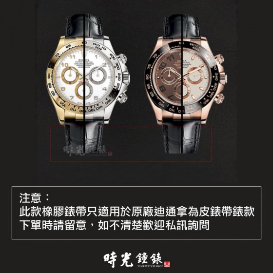 - 本產品與最初用於皮革/鱷魚皮以外的任何類型手鍊的 Daytonas 不兼容。