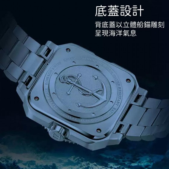 專為潛水愛好者而設的運動型腕錶,46毫米的錶殼以不鏽鋼打造,其「方中帶圓」的設計,配搭單向旋轉錶圈及橡膠錶帶,有利於水中操作。在錶盤上的時分指針和大型時標均覆有超級白夜光塗層物料,即便在漆黑之中,仍能輕易地讀取時間。搭載瑞士製自動機芯,腕錶具有日曆功能,防水深度達300米。