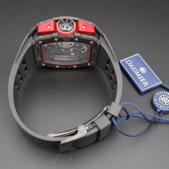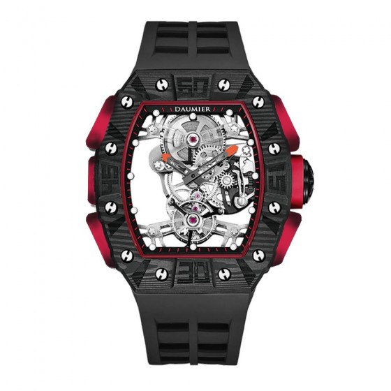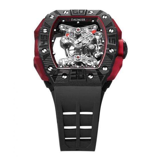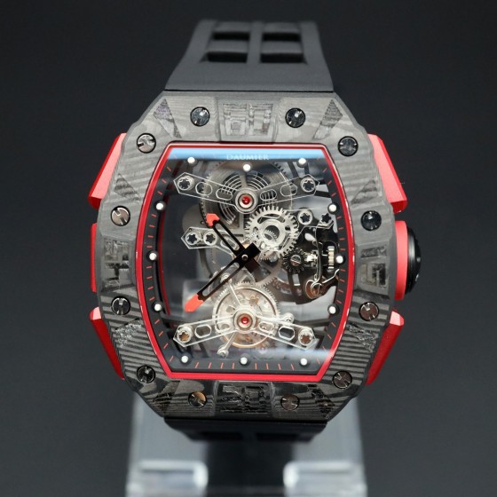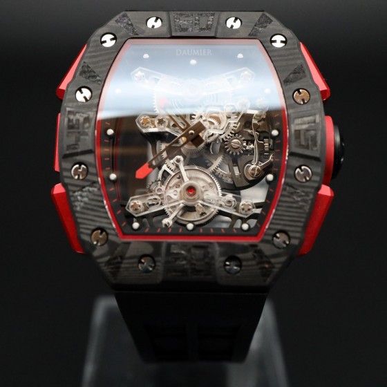 機芯資料及功能:高擺動頻率陀飛輪鏤空設計手動上發條機械機芯,陀飛輪透視劍形橋拱及六角型蜂巢式設計機芯支架,並獲得外觀設計專利