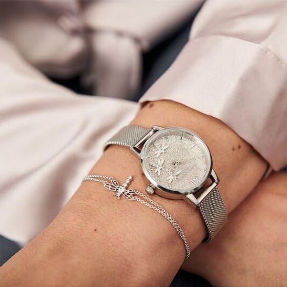 Olivia Burton OB16GB02 銀殼蜻蜓碎鑽面銀色米蘭編織腕錶