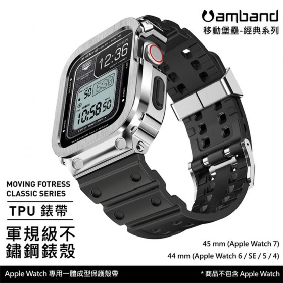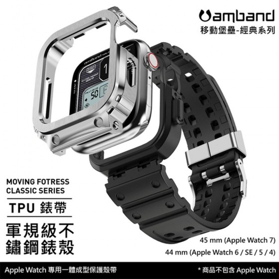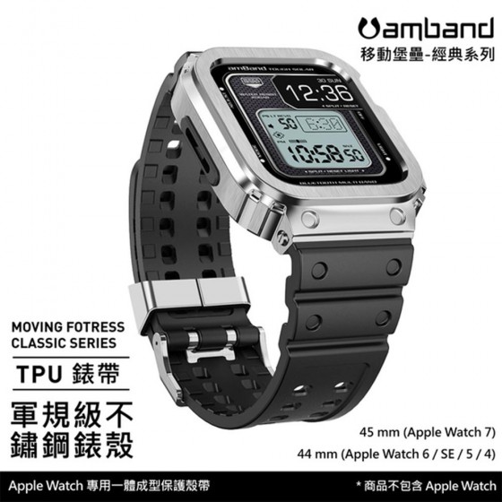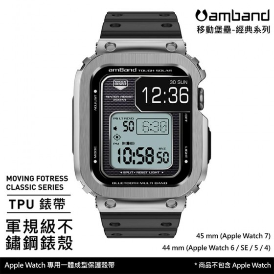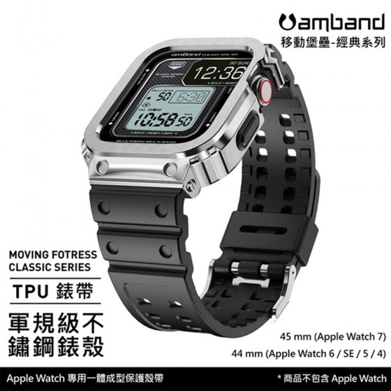 AmBand Apple Watch 專用保護殼 銀色軍規級鋼殼 X TPU 錶帶 44mm 45mm