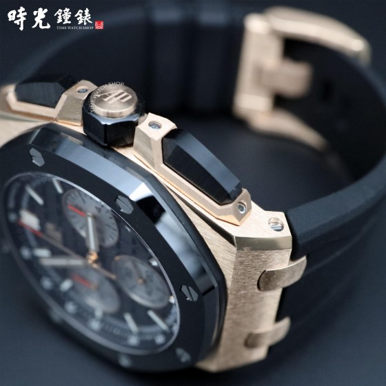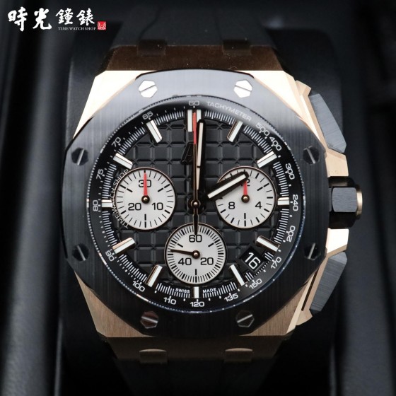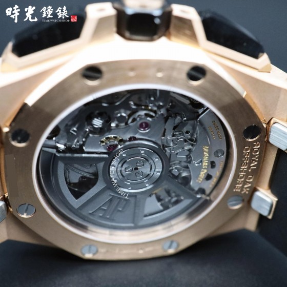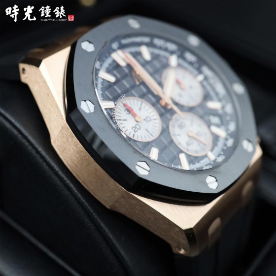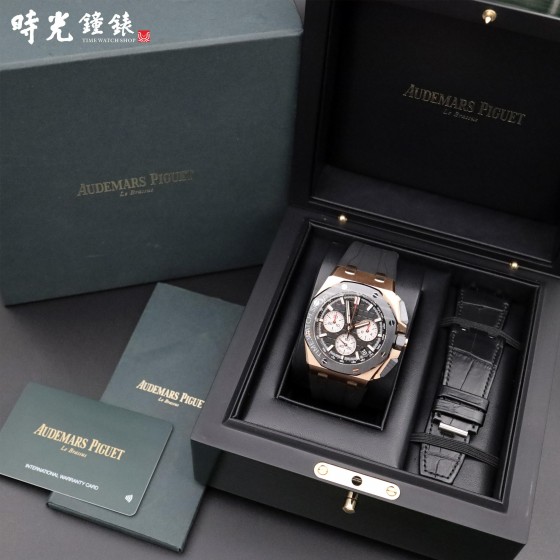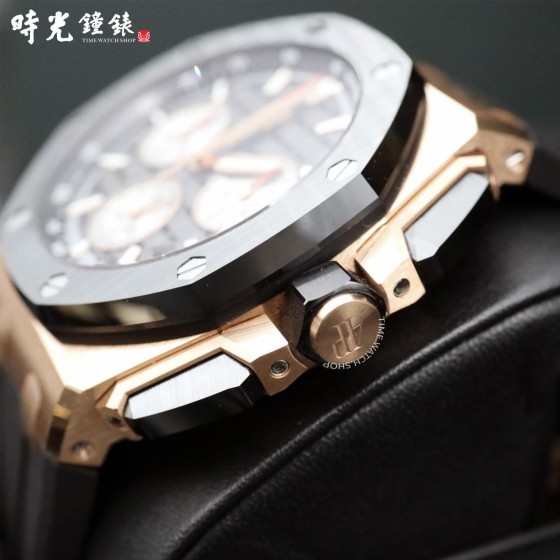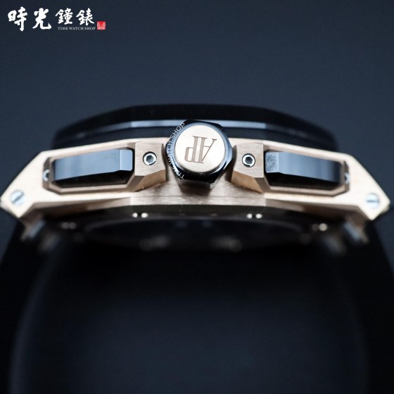 【錶帶】:黑色易換式橡膠錶帶18K玫瑰金AP字樣針式帶扣。附帶一條黑色鱷魚皮錶帶