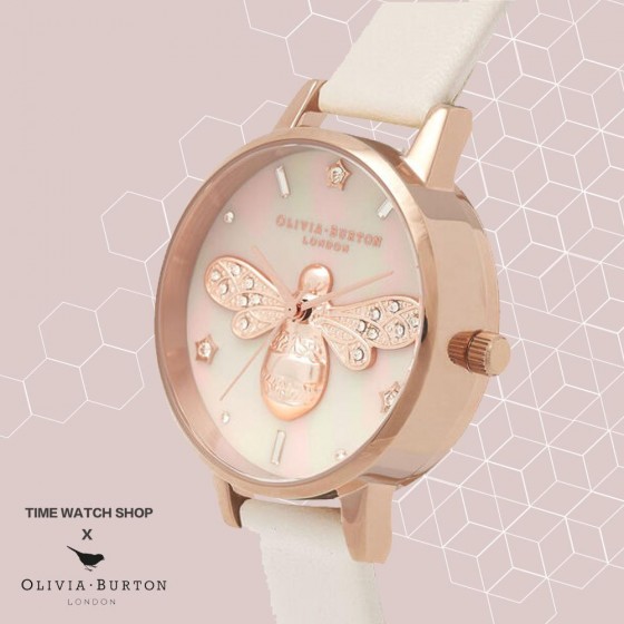Olivia Burton OB16GB10 玫金殼3D蜜蜂白貝面嫣杏色皮帶腕錶