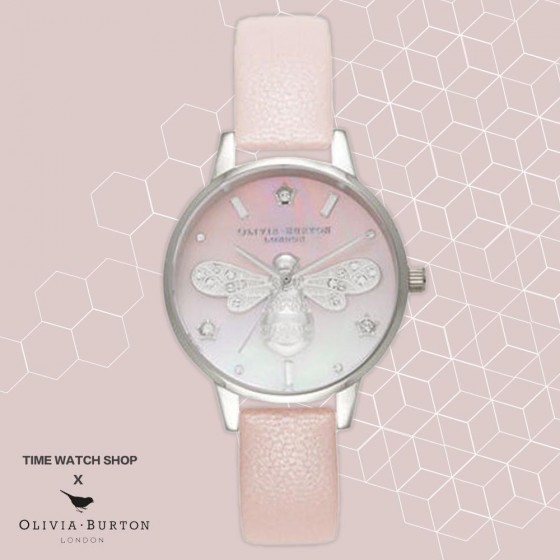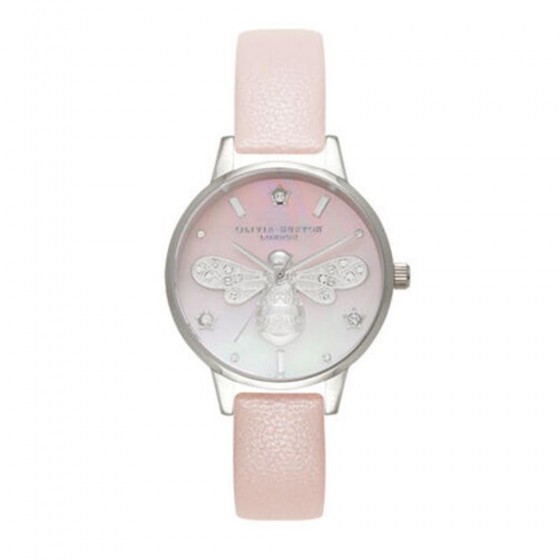 Olivia Burton OB16GB09 鋼色殼蜜蜂面嫣紅粉皮帶腕錶