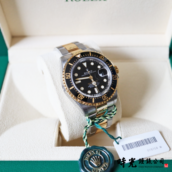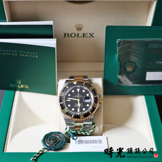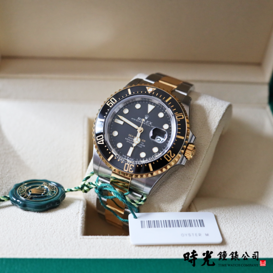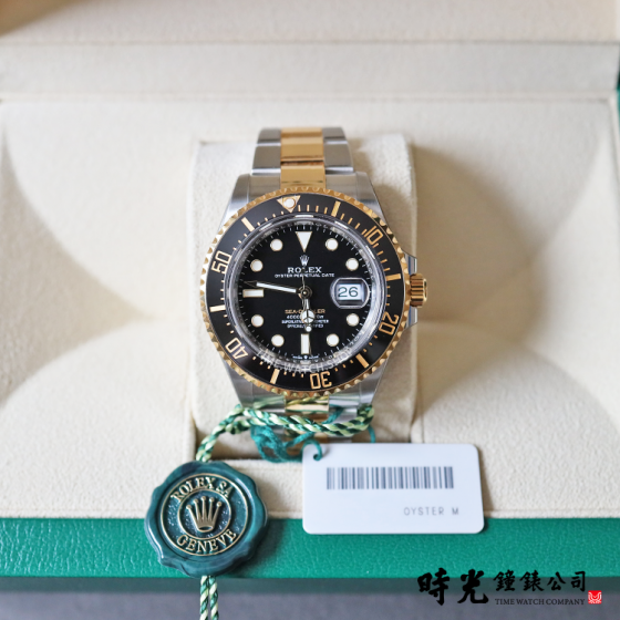 Oyster Perpetual Sea-Dweller腕錶黃金及蠔式鋼款,搭配黑色Cerachrom陶質字圈及蠔式(Oyster)錶帶。
